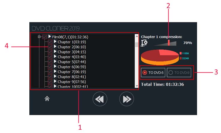 Select the title(s) you’d like to back up. The titles are listed as FilmX (a,b) (cc:dd:ee). X means the number of the film; a means the title number of the source DVD; b means the PGC number of the source DVD; cc means the length of the film by hour; dd means the length of the film by minute; ee means the length of the film by second; Open the FilmX project. If there are chapters, they will be displayed as Chapter f (dd:ee). f means the chapter number. (If not all the titles of the source DVD are listed, please disable the option “Enable Smart Analyzer before reading the disc” in the “Setup” window and try again.)