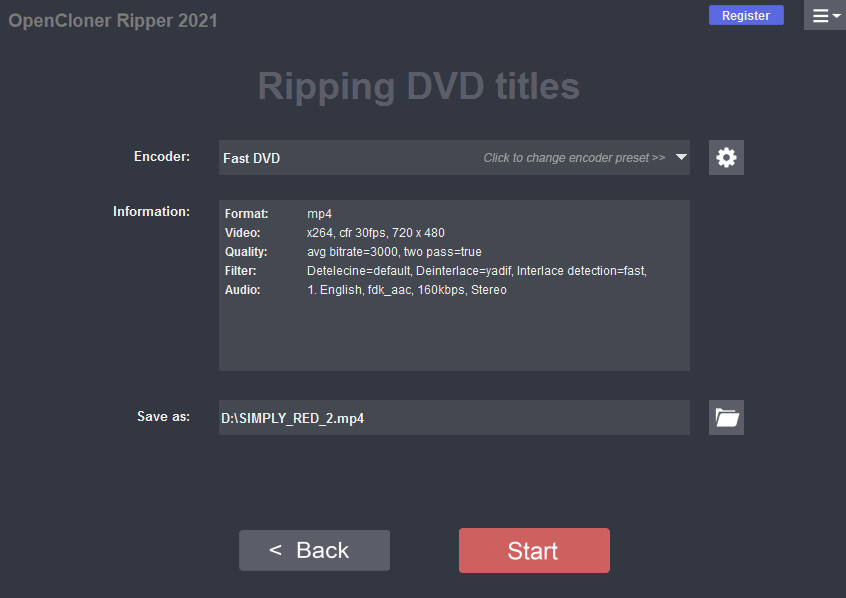 Step 3: Set Encoder. Select ‘Fast DVD’ preset, then click start.